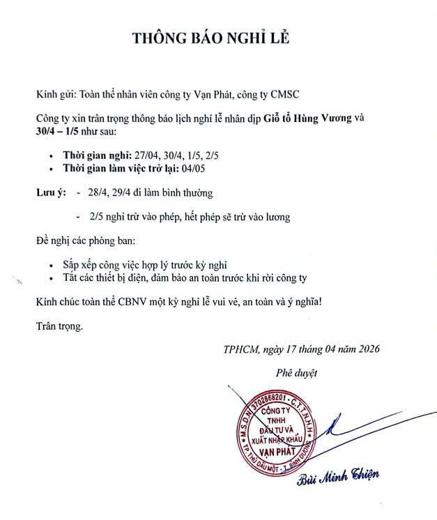 Kính gửi: Quý Đối tác, Quý Khách hàng cùng toàn thể Cán bộ Nhân viên (CBNV) công ty Vạn Phát và CMSC.