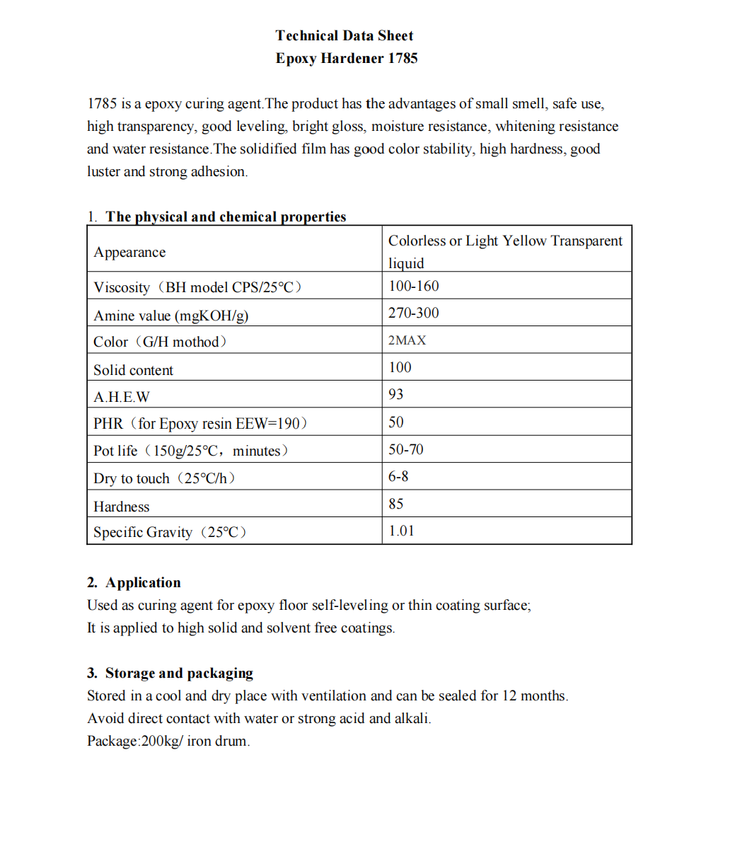 Epoxy 1785 là chất đóng rắn gốc amine dùng cho hệ nhựa epoxy, có đặc tính ít mùi, an toàn khi sử dụng, độ trong suốt cao, độ bóng và độ phẳng bề mặt vượt trội. Sau khi đóng rắn, màng tạo thành có độ cứng cao, độ bám dính tốt, khả năng kháng ẩm, kháng nước và chống hiện tượng trắng bề mặt trong môi trường độ ẩm cao. Ngoài ra, sản phẩm còn có khả năng duy trì độ ổn định màu sắc sau đóng rắn.