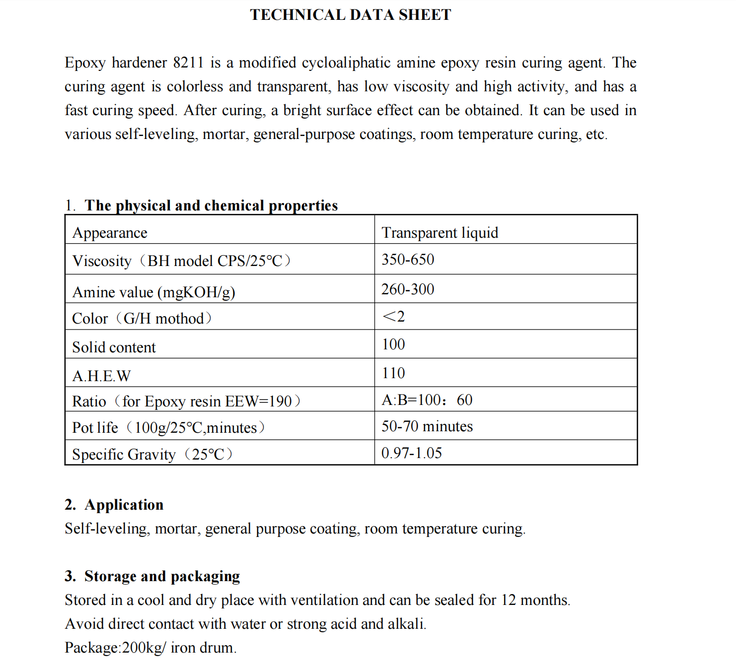 Epoxy 8211 là chất đóng rắn (hardener) gốc amine cycloaliphatic đã được biến tính, chuyên dụng cho hệ sơn epoxy. Sản phẩm có dạng lỏng không màu, trong suốt, độ nhớt thấp, hoạt tính cao, giúp rút ngắn thời gian đóng rắn. Sau khi phản ứng với nhựa epoxy, hệ sơn đạt được bề mặt sáng bóng, độ bền cơ học cao và khả năng chống mài mòn tốt. Thích hợp cho các ứng dụng sàn tự san phẳng, vữa epoxy, lớp phủ bảo vệ đa năng, có thể đóng rắn ở điều kiện nhiệt độ phòng.